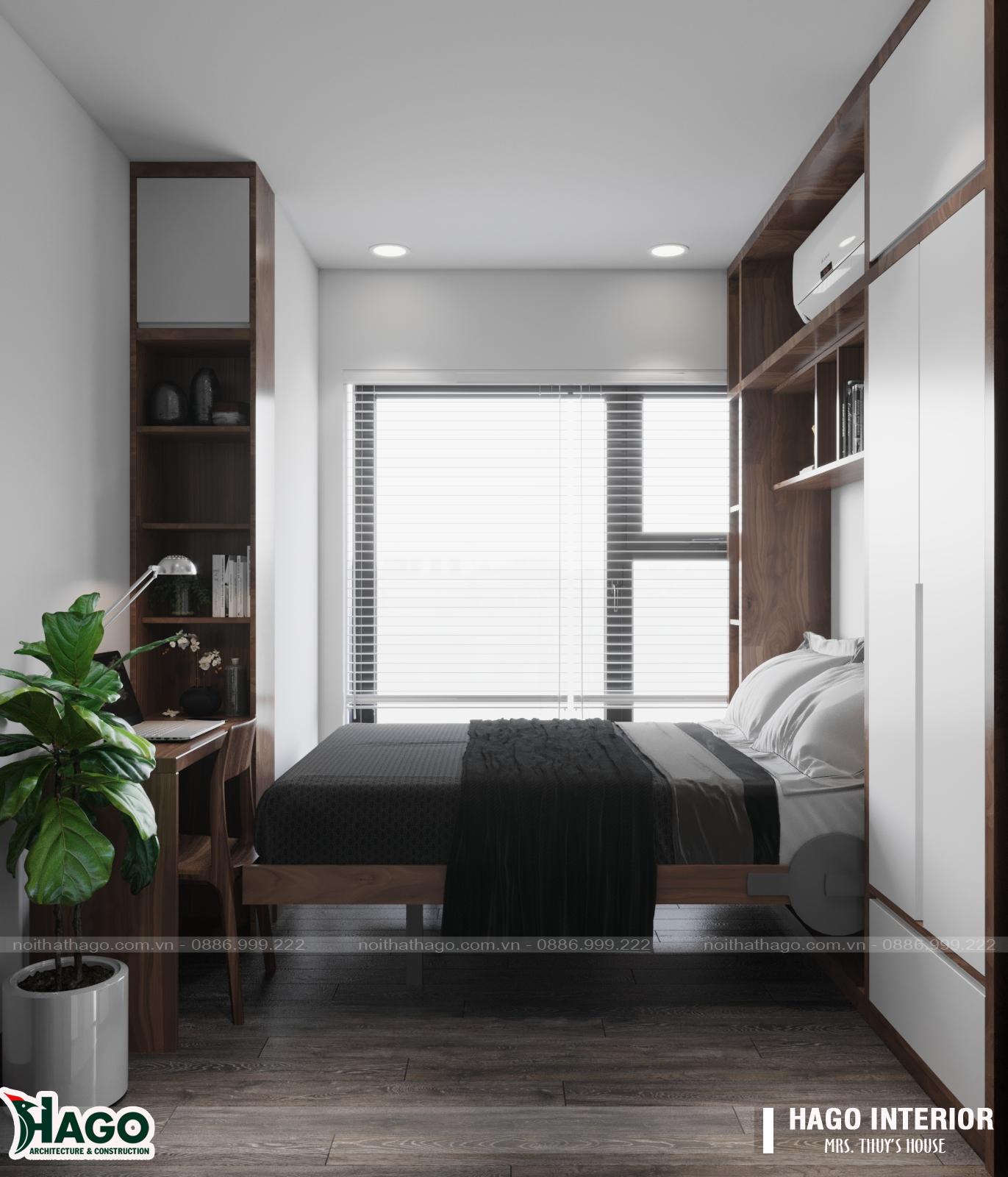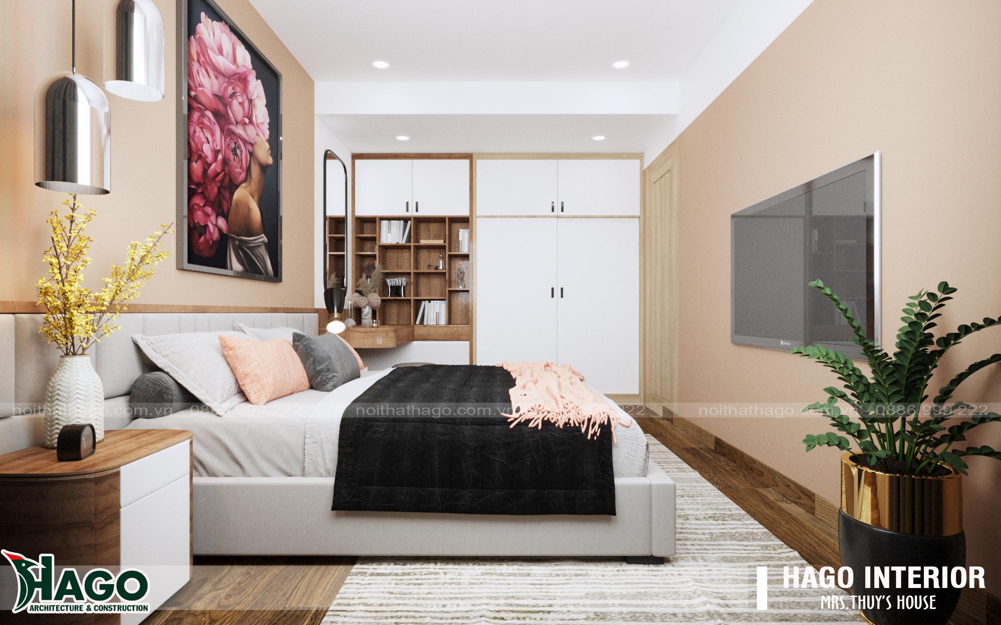 Phòng ngủ bố mẹ có sự kết hợp ăn ý giữa hai tông màu chủ đạo. Là trắng và nâu socola. Tạo nên không gian bình yên và thư thái. Căn phòng ngủ tiện nghi với chiếc giường chân đứng chắc chắn. Chiếc kệ tivi gỗ treo tường, bộ bàn làm việc hiện đại. Cùng với tủ quần áo rộng rãi