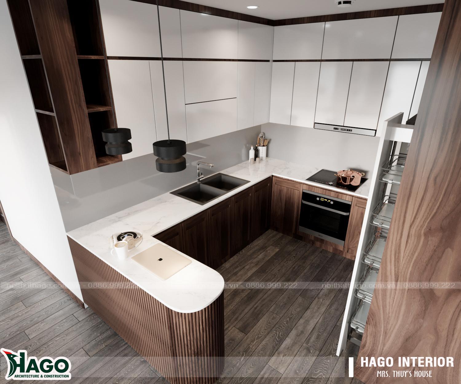 Căn hộ cao cấp với diện tích lên đến gần 100m2. Gồm 03 phòng ngủ, phòng khách thiết kế liên thông phòng bếp, bàn ăn. Cùng các không gian phụ tiện nghi. Mỗi không gian là một kiệt tác được kiến tạo từ KTS tài năng của Hago. Cùng vật liệu gỗ Sồi Nga nhập khẩu và chất liệu gỗ công nghiệp bền bỉ. Với tông màu Óc Chí huyền bí, sang trọng.