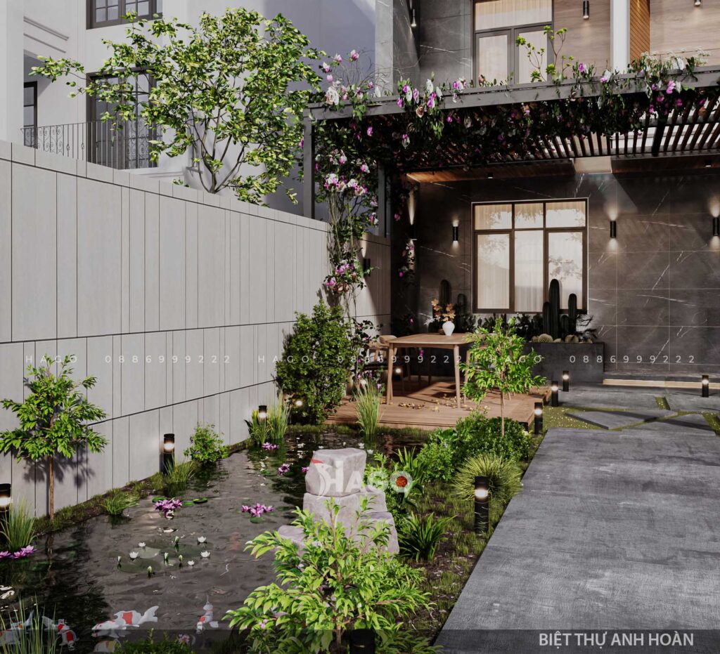 Thiết kế biệt thự ngày nay không thể thiếu yếu tố thiên nhiên. Cây xanh, tiểu cảnh nước, hoặc hồ bơi trong sân vườn đều là những lựa chọn giúp không gian sống trở nên thư giãn hơn. Việc tận dụng ánh sáng tự nhiên cùng các vật liệu thân thiện với môi trường như gỗ, đá tự nhiên làm tăng thêm tính bền vững và gần gũi. Hòa quyện với thiên nhiên không chỉ mang lại cảm giác thoải mái mà còn giúp gia đình tận hưởng những khoảnh khắc sống lành mạnh hơn. Đây là giải pháp hoàn hảo để nâng cao chất lượng cuộc sống và tăng giá trị cho căn biệt thự.